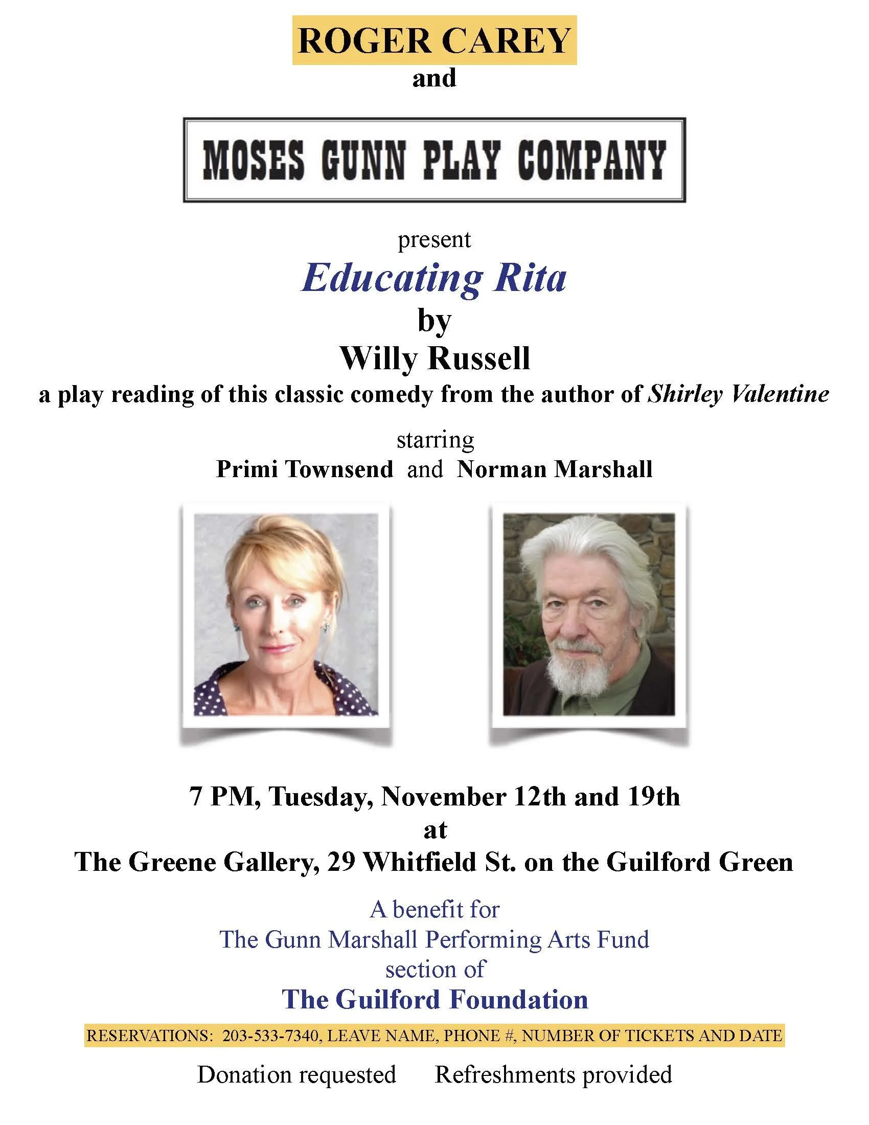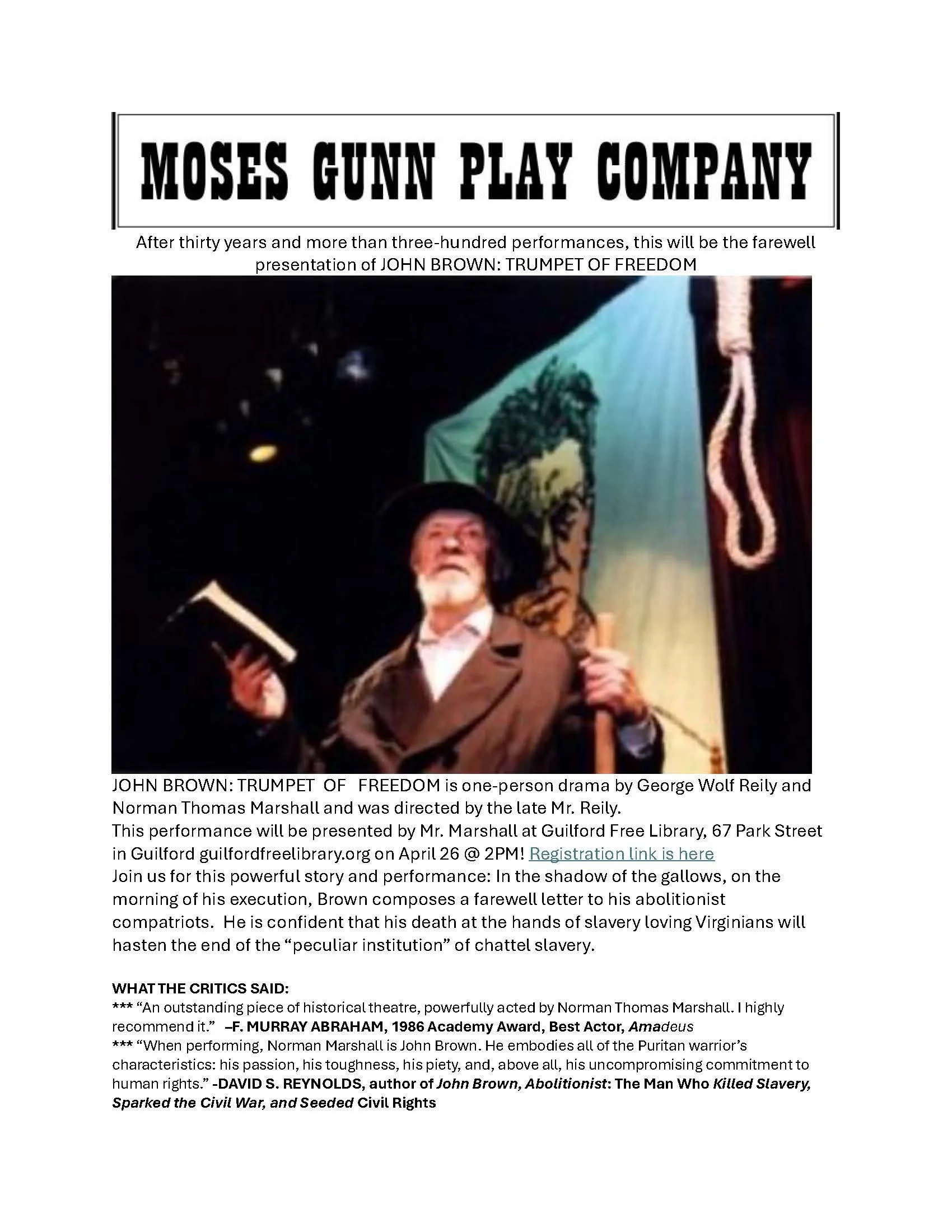 The Moses Gunn Play Company, based in Guilford, CT, was founded by Gwendolyn Gunn and Norman Thomas Marshall in honor of acclaimed actor Moses Gunn, a longtime Guilford resident whose legacy continues to inspire local artists. The company presents staged and concert-style readings of both classic and contemporary plays in local venues such as the Guilford Free Library. Its mission is to celebrate storytelling, foster cultural engagement, and bring high-quality, intimate theatrical experiences to the shoreline community, often through donation-based performances. Moses Gunn & Norman Marshall